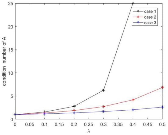 (1) When the λ = 0, the condition number is equal to 1. The condition number of A becomes larger as the value of λ increases. In case 1, the matrix A becomes singular when λ = 0.5. The result verifies the conclusion that the value of λ should not be too large.
