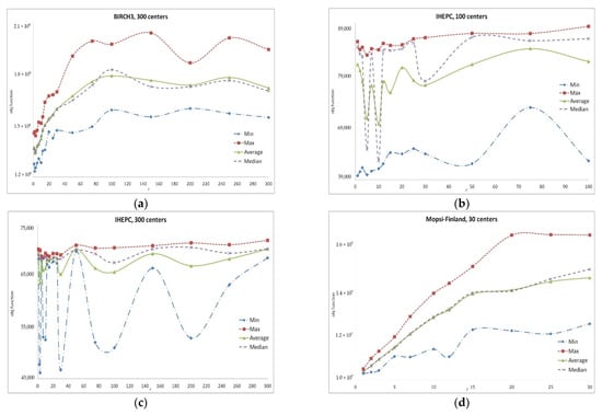 Comparative results of the search in SWAPr neighborhoods. Dependence of the result (1) on r: (a) BIRCH3 dataset, search for 300 centers, 100,000 data vectors, time limitation 10 s; (b,c) IHEPC dataset, search for 100 and 300 centers, respectively, 2,075,259 data vectors, time limitation 300 s; (d) Mopsi-Finland dataset, search for 30 centers, 13467 data vectors, time limitation 5 s.