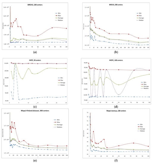 Comparative results of the search in AGGLr neighborhoods. Dependence of the result (1) on r: (a,b) BIRCH3 dataset, search for 100 and 300 centers, respectively, 100,000 data vectors, time limitation 10 s; (c,d) IHEPC dataset, search for 30 and 100 centers, respectively, 2,075,259 data vectors, time limitation 300 s; (e) Mopsi-Finland dataset, search for 300 centers, 13,467 data vectors, time limitation 5 s; (f) Mopsi-Joensuu dataset, search for 100 centers, 6014 data vectors, time limitation 5 s.