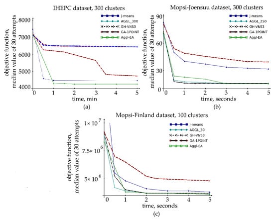 In the case of p-median and similar location problems, evolutionary algorithms recombine the initial solution obtained by the ALA procedure or a local search algorithm. In genetic algorithms, a set (population) of solutions is successively improved with the use special genetic operators (algorithms) of initialization, selection, crossover, and mutation. The crossover operator recombines the elements (“genes”) of two parent solution for generating a new (“offspring”) solution. One-point and two-point crossover which are standard for many other genetic algorithms have been proved to present drawbacks when applied to problems such as k-means and p-median problems [] due to generating the offspring solutions too far from their parents. The GAs with the greedy agglomerative crossover operator demonstrates better results [,,]. In this crossover operator, as well as in the IBC algorithms [,], the number of centers is successively reduced down to the desired number p. Being originally developed for the network p-median problems, they were adapted for continuous p-median and k-means problems []. Metaheuristic approaches, such as genetic algorithms [], are aimed at finding the global optimum. However, in large-scale instances, such approaches require very significant computational costs, especially if they are adapted to solving continuous problems []. The greedy agglomerative procedure is a computationally expensive algorithm, especially in the case of continuous problems when it includes multiple execution of a local search algorithm. However, this procedure allows us to find solutions that are difficult to improve by other methods without significantly increasing the calculation time.