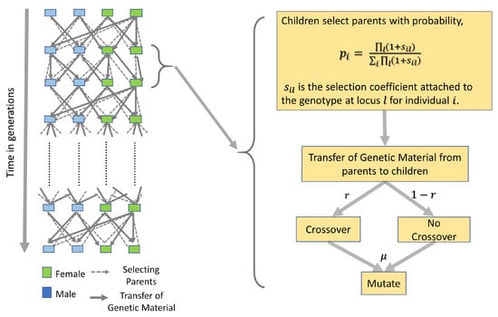After the children have randomly selected their parents, the child requests one chromosome from each of the parents. The parents randomly select whether to pass one of their two chromosomes, or to construct a new chromosome via a recombination event involving a crossover between its two chromosomes with respect to the recombination rate, r. If a crossover is generated, the parent randomly selects a location and transfers the genetic material up to that location from one chromosome and the rest from the its other copy. This is done in part to reconstruct the ARG, and to characterize genetic variation along chromosomes yielding the final recombinations []. In case of no recombination, the parent randomly decides which chromosome’s genetic material should be passed over to the child (see Figure 1 of the main manuscript).
