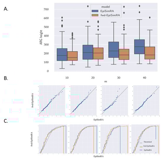 Comparing the height of the ARG (H) between fwd-EpiSimRA and EpiSimRA with and without epistatis in two loci with recombination for , kbp, , , with epistastic parameters for . (A) The box-and-whisker diagram summarizes the result for each. On each box, the central mark is the mean, the edges of the box are the 25th and 75th percentiles, the whiskers extend to the most extreme data points not considered outliers, and outliers are plotted individually. (B) QQ plot and (C) CDF plot of the backward and forward models show similar distributions.