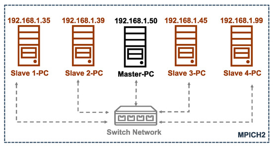 LSGO benchmarks and many real-world problems require a large number of computing resources, thus it is hard to make numerical experiments using a regular PC. In [27], the authors have presented the required time for evaluating the LSGO benchmark using Intel(R) Core(TM)2 Duo CPU E8500 @3.16 GHz. All our experiments using this CPU in the single-thread mode require about 258 days. Our cluster evaluates the benchmark in less than two weeks. The cluster uses C++ programming language and operates in Ubuntu 20.04 LTS. The detailed description of each computing node is presented in Table 2. Figure 1 presents the structure of our cluster. We have five PCs: one Master-PC and four Slave-PCs. Master-PC sends computational tasks to all Slave-PCs. All numerical results are collected in *.txt files and are stored in Master-PC. We use MPICH2 (Message Passing Interface Chameleon) [50] for connecting computers together and solving parallel tasks. The cluster model is scalable. The complete code of the iCC-SHADE algorithm is available at GitHub (https://github.com/VakhninAleksei/MDPI_Algorithms_2021-iCC-SHADE, accessed on 31 March 2021).