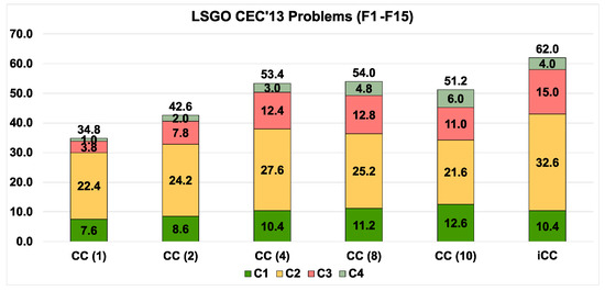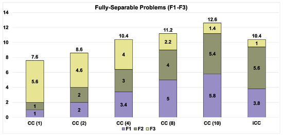 As we can see from Figure 2, the performance of decomposition-based algorithms strongly depends on the number of subcomponents. We can observe this dependence on F1 and F2. For F3, CC(10) demonstrates better results on average. iCC shares third place with CC(8) on all fully separable functions. CC(10) and CC(8) have taken first and second place, respectively.