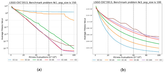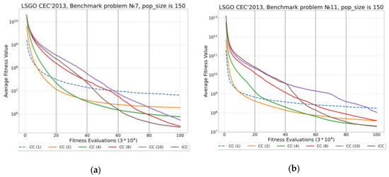 This subsection presents the experimental results of iCC-SHADE and CC-SHADE with the fixed number of subcomponents for the LSGO CEC’13 benchmark. We have used the following settings for CC-SHADE and iCC-SHADE: the population size for each subcomponent is , the number of subcomponents is , , the size of an external archive is . We use “CC(m)” and “iCC” notations, where CC(m) is CC-SHADE with m fixed subcomponents, and iCC is iCC-SHADE.