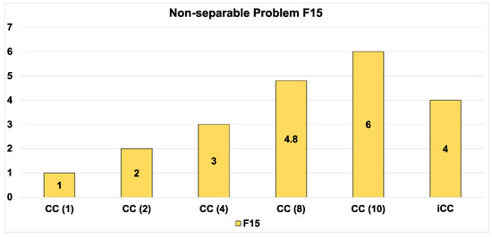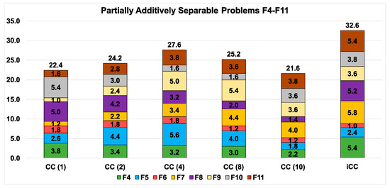 Partially Additively Separable Problems in the benchmark are F4–F11. The average ranks for CC(m) and iCC are presented in Figure 4. As we can see, CC(4) demonstrates the best performance in comparison with all algorithms with the fixed numbers of subcomponents. iCC demonstrates the best result in comparison with all CC(m). Table 5 and Table 6 have the same structure as Table 3 and Table 4, respectively. iCC has the maximum number of “win” and the minimum number of “loss” points in comparison with all CC(m). Figure 5 shows convergence graphs for CC(m) and iCC.