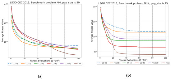 Convergence graphs for CC and iCC on F4 and F14 with different population size (F#-pop_size: (a) F4-50; (b) F14-25)