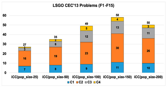 We have estimated the performance of CC(m) and iCC on the fully separable problems (F1–F3). Figure 2 shows the average ranks of metaheuristics with the different numbers of pop_size. Ranks are based on the mean values, which are obtained from 25 independent runs. The lowest mean value gives the highest rank.