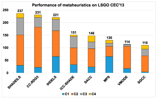 We have compared fine-tuned iCC-SHADE with the following metaheuristics: SHADEILS [51], CC-RDG3 [52], IHDELS [53], SACC [54], MPS [55], VMODE [56], and SGCC [57]. These state-of-the-art metaheuristics were specially created for solving LSGO problems. We have used the Formula-1 scoring system for ranking the mean best-found values. The list of points is the following: “25, 18, 15, 12, 10, 8, 6, 4, 2, 1”. As we compare eight metaheuristics, the best-performed and the worst-performed algorithm will get 25 and 4 points, respectively.