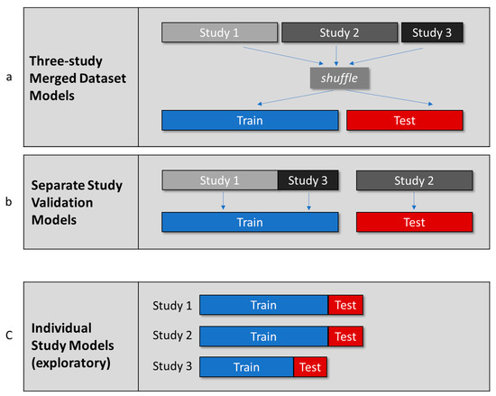 The three types of models developed in this study, including: (a) Three-study Merged Dataset Models; (b) Separate Study Validation Models; (c) Individual Study Models. The lengths of the bars approximately indicate the size of the datasets.