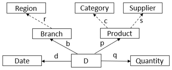 Now, the attributes d, b, p and q of our running example are “factual” or “direct” attributes of D in the sense that their values appear on the delivery invoices. However, apart from these attributes, analysts might be interested in attributes that are not direct but can be “derived” from the direct attributes. Figure 1 shows the direct attributes together with several derived attributes: attribute r can be derived from attribute b based on geographical information on the location of each branch; and attributes s and c can be derived from a product’s master table. The set of all attributes (direct and derived) that are of interest to a group of analysts is called an analysis context (or simply a context).