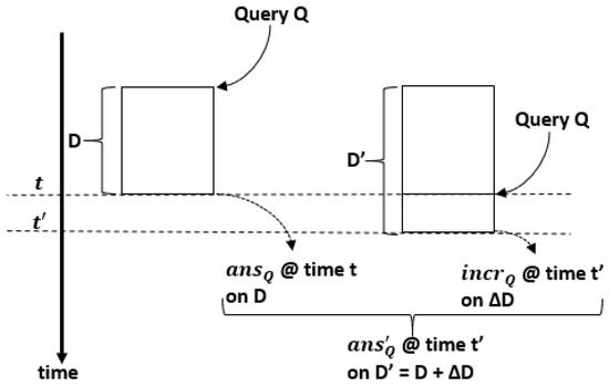 Figure 3 illustrates our incremental approach for continuous queries—the same query asked two times. We perceive the problem of incremental evaluation as follows: let be the answer of continuous query Q at time t, on dataset D; let be the answer of Q at time on dataset , where ; and let be the answer of Q at time on dataset . Moreover, let K be the key of Q at time t and let be the key of Q at time .