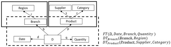 To this end, next we present examples of mapping analytic queries directly to SQL. We shall use the context of the Figure 5 and we assume that the dataset is stored in the form of a relation using the star schema shown in that figure. In general, a star schema includes one or more fact tables, indexing a number of associated dimension tables. In our example, this star schema consists of the fact table FT and two-dimensional tables: the dimensional table of the branch and the dimensional table of the product. The edges of the context are embedded in these three tables as functional dependencies that the tables must satisfy, and the underlying attribute in each of these three tables in the key of the table.