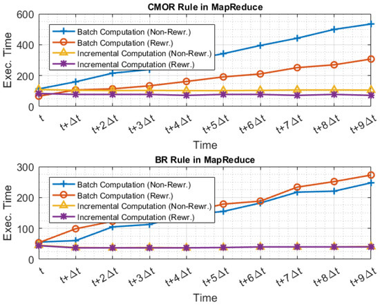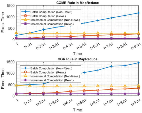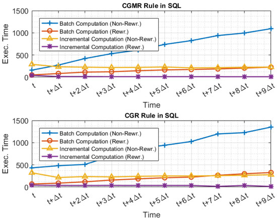 Figure 8 and Figure 9 illustrate the evaluation times when Q and were executed using the MapReduce execution model and the two different approaches; Figure 10 illustrates the evaluation time when Q and are executed using the SQL execution model and the two different approaches. For example, at time , the batch computation approach requires one to execute the query set Q or the rewritten set , over all data generated in range of . At time , the incremental computation approach requires one to execute the query set Q or the rewritten set only on data generated in range of , and then incorporates the increment into the aggregated result.