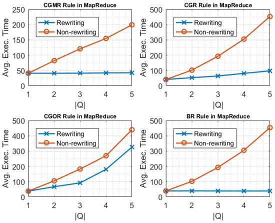 In this experimental protocol we focused more on the effectiveness of the rewritings, when the incremental processing approach was used to refresh previously generated results. We also used the queries defined in previous experiment for each rewriting rule. Firstly, we evaluated the non-rewritten set Q by running the query evaluation process for it. We started by including only one query in Q, and gradually increasing the query number to reach queries. In this scenario, each included query in Q was executed for each micro-batch individually, and we report the average execution time. Secondly, we evaluated the execution of the rewritten set by starting again with one query () and gradually increasing the query number to . In this scenario, each included query in is executed for each micro-batch, and the average execution time is reported.
