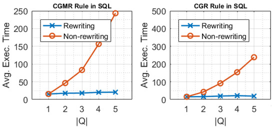 Figure 11 and Figure 12 illustrate the results for this series of experiments. As shown, when Q was executed without rewritting, the execution cost increased as the number of participating queries increased as well. Moreover, we observed that even with the more queries participating in the rewritten set , the execution cost remained the same. The variation in the execution time between the rewriting rules arose due to the nature of the queries included in the non-rewritten set Q and depends on the types of shared common attributes.