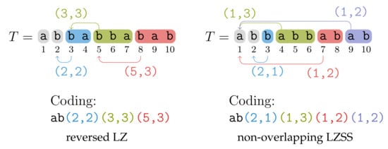 - Goto, K.; Bannai, H. Space Efficient Linear Time Lempel–Ziv Factorization for Small Alphabets. In Proceedings of the 2014 Data Compression Conference, Snowbird, UT, USA, 26–28 March 2014; pp. 163–172. [Google Scholar]