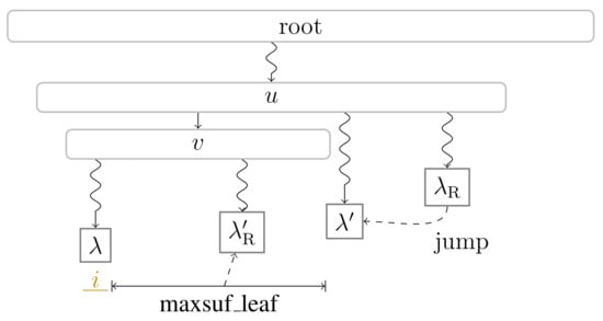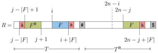 To show that each referencing factor is indeed the string label of an node, we review the definition of right-maximal repeats: A right-maximal repeat is a substring of R having at least two occurrences and with . A right-maximal repeat is the string label of an node since this node has at least two children; those two children are connected by edges whose labels start with and , respectively. It is therefore sufficient to show that each factor F is a right-maximal repeat. Given j is the referred position of , . If , then , and thus F is a right-maximal repeat. For the other case that , assume that F is not a right-maximal repeat. Then . However, this means that F is not the longest reversed factor being a prefix of , a contradiction. We visualized the situation in Figure 3. □