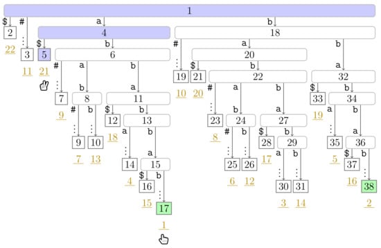 If Player 1 is at a non-phrase leaf , we skip the turn of Player 1, move Player 1 to at Line 19, and let Player 2 take action. Now suppose that Player 1 is at a phrase leaf corresponding to a factor F. Then we traverse the path from the root to downwards to find the lowest ancestor w of marked in . If w is the root node, then F is a fresh factor (cf. Line 11), and we know that the next factor starts immediately after F (cf. Line 13). Consequently, the leaf is a phrase leaf. Otherwise, w is the witness of , and (cf. Line 14). Hence, is the suffix number of the phrase leaf that Player 1 will subsequently access. We therefore mark w and in and in , respectively (cf. Lines 16 and 18). We depict the fifth turn of our running example in Figure 5, during which Player 1 marks a witness node. Finally, we end the turn of Player 1, move Player 1 to at Line 19, and let Player 2 take action.