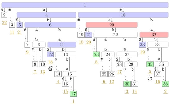 Suffix tree of used in Section 3.2, where is our running example. The nodes are labeled by their preorder numbers. The suffix number of each leaf is the underlined number drawn in dark yellow below . We trimmed the label of each edge to a leaf having more than two characters and display only the first character and the vertical dots ‘⋮’ as a sign of omission. The tree shows the state of Algorithm 1 after the first turn of both players. The nodes visited by Player 2 are colored in blue (