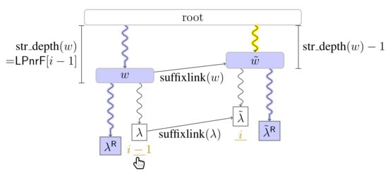 Correctness. When Player 1 accesses the leaf with suffix number i, Player 2 has processed all leaves with suffix numbers . Due to the leaf-to-root traversals of Player 2, each node marked in has a leaf with a suffix number in in its subtree. In particular, a node w is marked in if and only if the string label of w is a substring of . Because , the longest prefix of having a reversed occurrence in is therefore one of the string labels of the nodes marked in . In particular, we search the longest string label among those nodes, which we obtain with the lowest ancestor of marked in .