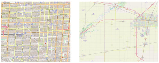 Grid-like substructures in real networks (Manhattan on the left, Urbana-Champaign on the right) (by OpenStreetMap).