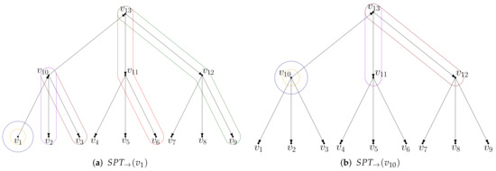 Our actual greedy algorithm is stated in Algorithm 1. As we made sure that conflicts can only occur between triples with identical hop length, we can restrict the check for conflicts to the candidate set of triples of identical hop length. For an example of our greedy heuristic execution, look at the shortest path trees in Figure 7: Let us assume we collected the set of candidates for length 3 which contains , , , and beside other triples. We now pick the candidate and add it to W. Clearly, we remove this from our candidate set but we also have to remove because it would lead to a conflict in the forward shortest path tree and also remove because of the conflict in the backward tree .