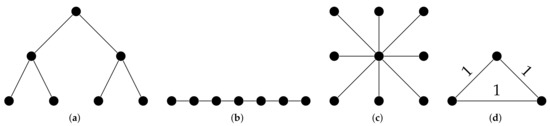 Example for Graphs. (a) Balanced binary tree; (b) Path graph; (c) Star graph; (d) Triangle graph.