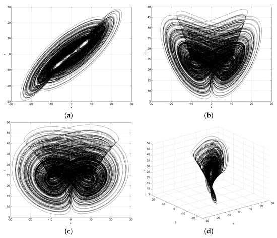 The three-dimensional phase diagram of Chen’s chaotic motion state. (a) The x–y plane phase diagram; (b) The y–z plane phase diagram; (c) The x–z plane phase diagram; (d) The Spatial phase diagram of Chen chaos.