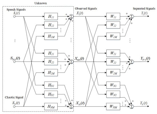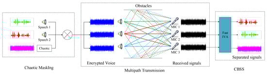 In recent years, the chaotic phenomena of nonlinear systems have been studied more and more intensively [,,]. Chaos is a nonperiodic bounded dynamic behavior caused by a deterministic nonlinear dynamic system. It has initial sensitivity, internal randomness and unpredictability [], which make it play an important role in secure communication. Considering the secure transmission of speech information in wireless transmission environment, the speech signal can be chaotic encrypted or masked at the originating end. For indoor environments, a classic problem of speech communication is the “cocktail party”. In a noisy indoor environment, the sound received by the information-collecting microphone is diverse. The sound received includes the speech, music and other sound sources of multiple people talking at the same time, and there is also the reflected sound generated by the reflection of these sounds by the walls and indoor objects. In fact, whether in indoor or outdoor environments, speech transmission under multipath channels can be abstracted as a convolutional mixed model of signals. At the same time, there is bound to be a lack of source information and channel information during the transmission process. Therefore, separating the desired speech signal from the unknown information is known as classic multichannel convolutional blind source separation (CBSS) [,,].