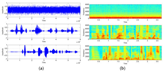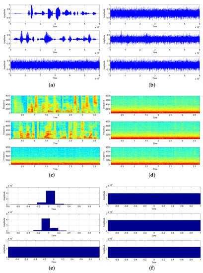 The image information of the source signal and the observed signal after chaotic masking is shown in Figure 4. The time-domain waveform, spectrograms and histogram of the observed signal are given in Figure 4b–f, respectively, to compare the graphical information of the observed signal with that of the source signal. It is obvious that the source speech information is no longer found in the observed signal, which is enough to show that the chaotic signal plays a good masking effect on the speech signal and achieves the confidential transmission of speech information.