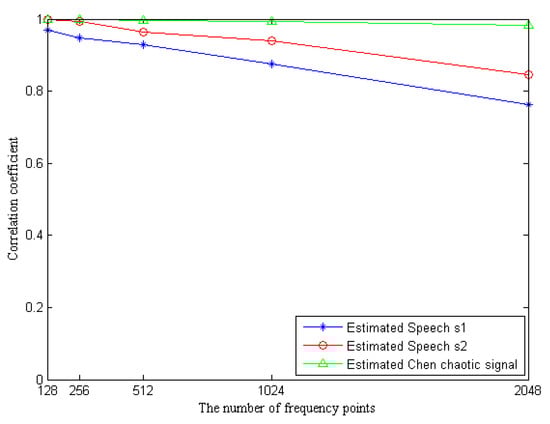 The effect of the parameter selection of frequency points on the separation result is intuitively reflected in Figure 6. The larger the number of frequency points, the larger the number of samples in the short time window. For a speech signal with a certain length, the fewer frames are obtained by adding windows, which makes more speech features lost and results in a poorer recovered speech signal. With a smaller the number of frequency points, the opposite result is obtained. The experimental results in Figure 6 also confirm this relationship. When the number of frequency points , the average correlation coefficients of the speech estimation signals extracted by this algorithm are all above 0.96, and the separation effect is very good. When the number of frequency points , the correlation coefficients of the estimated signals of speech s1 and s2 can reach about 0.92 and 0.96, respectively. Although the correlation coefficients have decreased, the separation results are still better. When the number of frequency points or even larger, the correlation coefficient of the speech estimation signal decreases more obviously, which makes the separation result worse. To ensure that the separation results obtained by this algorithm are better and to avoid too much computation in the STFT process, we compromise by choosing a frequency point . In addition, it can be seen from Figure 6 that the change of frequency points has little effect on the separation results of Chen’s chaotic signal. Therefore, the superiority of the algorithm used in this paper is that it can guarantee the quality of the separated speech signal of good quality while still extracting the chaotic signal of noise class well.
