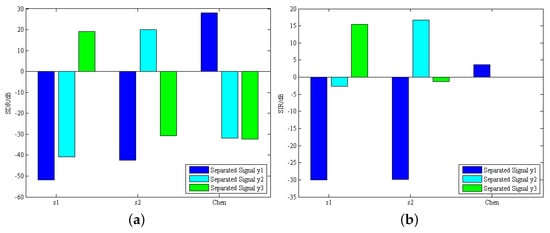 Figure 7 represents the performance evaluation of the separation results by different metrics; that is, the SDR and SIR values between each separated signal and the source signal, where s1 and s2 represent the two source speech signals and Chen is the chaotic signal. As shown in Figure 7a, the dark blue bars indicate the SDR values obtained after comparing the separated signal with s1, s2 and s3. The SDR values with s1 and s2 are negative, and the SDR value with Chen is 27.9537 dB, which determines that the separated signal is chaotic. Furthermore, the SDR values of the estimated signals of source speech s1 and s2 are also both close to 20 dB, which shows that the separated signals are less affected by distortion and interference. Similarly, in Figure 6b, the SIR values with s1 and s2 are negative due to the higher energy and larger bandwidth of the chaotic signal, and the SIR with s3 is calculated to be 3.6834 dB. The SIR values of both s1 and s2 estimated signals are calculated to be around 15 dB, while the SIR value of the chaotic signal is almost 0, indicating that the estimated signal has few components separated from other sources, which in turn proves the superior performance of the separated signal.