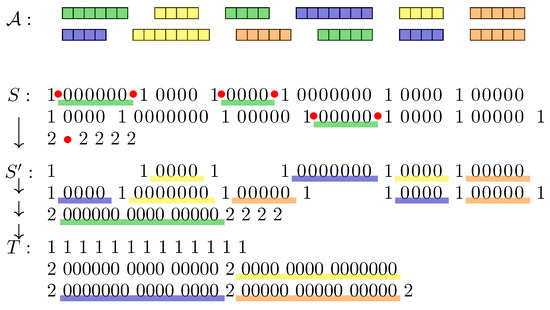 Example of the proposed reduction starting from the following instance of 3-Partition: (thus ) and . Each is represented by a rectangle containing squares. Colors in describe a way to partition into triplets, each summing to . S and T are built as described in the reduction. Each vertical arrow corresponds to a 7-cut. The first one, which is the first step of the proposed 7-cut rearrangement scenario, going from S to , is detailed: each red bullet corresponds to a cut, and blocks of 0 that are rearranged are underlined in green (corresponding to the three “green s” summing to B).