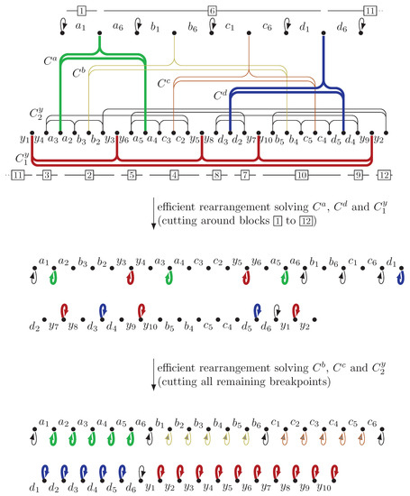 where the suffix of S is the concatenation of for every , followed by . Finally, we set . Note that strings S and T have adjacencies (0, and each , ), so they have breakpoints. We compute the cycles of . To this end, we describe cycles (denoted , , and ), and check that their total size is indeed equal to the number of breakpoints.