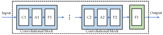 CNNs are generally composed of convolutional blocks and fully connected layers, as described in Figure 1. The convolutional block consists of a convolution layer (C), pooling layer (P), and activation function (A), which is mainly used to extract features and perform nonlinear transformations. The fully connected layer (F) is used to output classification or regression results.