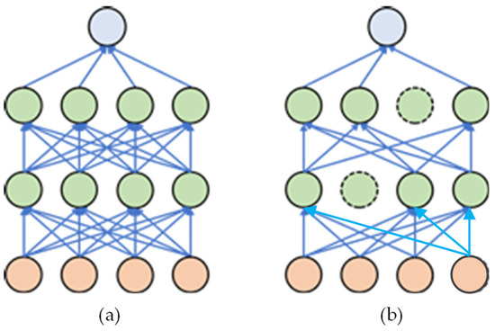 Deep learning models with a large number of parameters are prone to overfitting during the training process, leading to an unsatisfactory prediction effect of the trained model on the test set; i.e., the generalization ability of the model is seriously insufficient. Srivastava et al. [35] proposed the dropout method, which effectively solves the overfitting problem and improves the generalization ability of the model. The core idea of dropout is to randomly disconnect a slice of neurons and their corresponding connections when training deep networks so that they do not participate in the training, as shown in Figure 3. To some extent, dropout is equivalent to artificially adding noise to the model, allowing the model to learn more effective data features during the training process and improving the representation ability and robustness of the model.