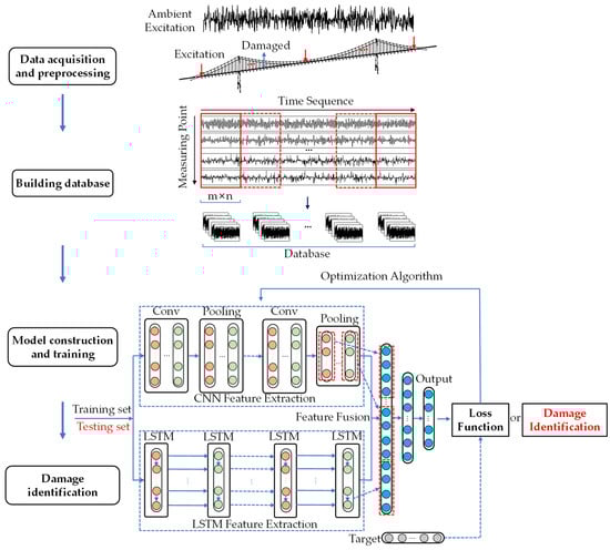 - Model construction and training: the framework of the CNN-LSTM model is constructed, and the features extracted by CNN and LSTM are merged in the fully connected layer. Then, the training and validation sets are utilized to train and verify the model, and the model is optimized according to the training results to find a damage identification model with better performance.