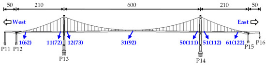 Layout of a long-span suspension bridge and numbering of hangers (unit: m).