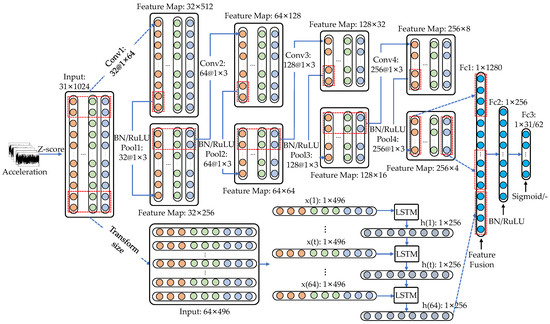 The model input adopts the acceleration with dimensions of 1024 × 31, where the input height 31 is the number of hangers, and the input width 1024 is the sequence length. However, the input dimension of the LSTM layer is related to the time step and sequence length. This study sets the input dimension of the LSTM layer to 64 × 496, where 64 is the time step and 496 is the sequence length. Therefore, the sample dimensions need to be converted according to the following steps. Each sample is divided into 16 parts with dimensions of 64 × 31. Then, the 16 parts of the data are spliced along the first dimension into a sequence of 496 acceleration data points, so the transformed sample dimension is 64 × 496.