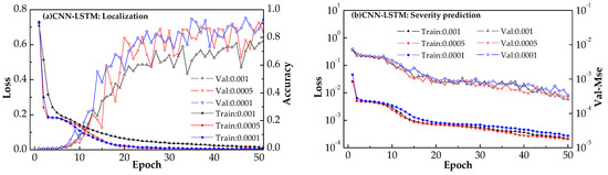 Influence of different learning rate on CNN-LSTM: (a) Localization; (b) Severity prediction.