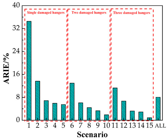 When calculating the ARIE, this study only focuses on the damaged hangers. The value of the evaluation index ARIE is calculated according to Equation (15) and presented in Figure 10.
