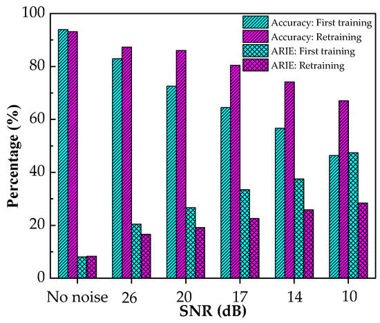 The CNN-LSTM model was retrained with a new training set composed of samples with Gaussian noise (SNR: 10, 5, and 3.33) and noise-free samples, and the test set with different noise levels was fed into the retrained model. The test results are shown in Figure 11. It can be seen from Figure 11 that the anti-noise performance of the CNN-LSTM model after retraining with noisy training samples was greatly improved. When the SNR is 5 and 3.33, the accuracy of the damage localization of the hangers is increased by 17.40 and 20.66%, and the ARIE of the severity prediction is reduced by 11.67 and 19.00%, respectively. The results show that using the acceleration response dataset containing noise for the second training of the model can effectively improve the anti-noise performance of the model against higher noise levels. Simultaneously, it also indicates that the proposed model can quickly learn the damage characteristics in the acceleration response with noise and has a strong learning ability.