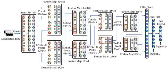 Based on the time series modeling ability of LSTM, this paper combines it with CNN for damage identification, obtaining promising results. However, it is essential to compare the performance of the CNN-LSTM model against the CNN model to further verify the merit of this research. The architecture of the corresponding CNN model is presented in Figure 12, and the detailed parameters of such a model are tabulated in Table 6. The training set, validation set, and test set of these two models come from the database established in Section 3.2.