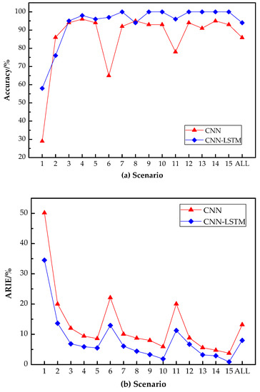 As shown in Figure 13, compared to the CNN-based damage identification method, the overall recognition accuracy of the damage localization based on the CNN-LSTM model increases by 8.13%, and the ARIE of severity prediction decreases by 5.20%.