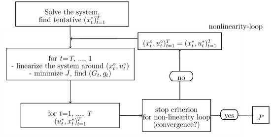 The corresponding optimal control objective function can be written in the same form as in (3) and (4). Using well-known LQ optimization techniques, the rules for defining control variables can be found iteratively backwards in time using dynamic Riccati equations. We start from the familiar LQ framework (e.g., [20]), which was adapted to economic models by [15,21,22]. The same standard technique is applied in the OPTCON algorithm whenever an optimal control for a linearized system should be obtained.