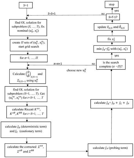 The optimization is carried out in a forward loop from 1 to T conducting following procedure in each time period S (). The subproblem from S to T is solved via the open-loop (OL) strategy (see Figure 1 in Section 3.1). The OL solution for the time period S is fixed. After that the core part of the dual control strategy starts, where the system is actively perturbed to learn about it in order to minimize the uncertainty and the objective function values in the future. In the OPTCON3 algorithm a grid search method is used (instead of grid search many other methods can be applied, such as gradient optimization or a more advanced heuristic approach). In the so-called “-loop” we create a grid of possible solutions around the existing path . In each iteration (), i.e., in each grid point, the optimal control solution is obtained and evaluated using the objective function. Inside the -loop (for each ), the following steps are carried out.