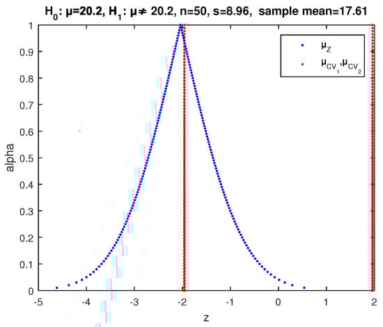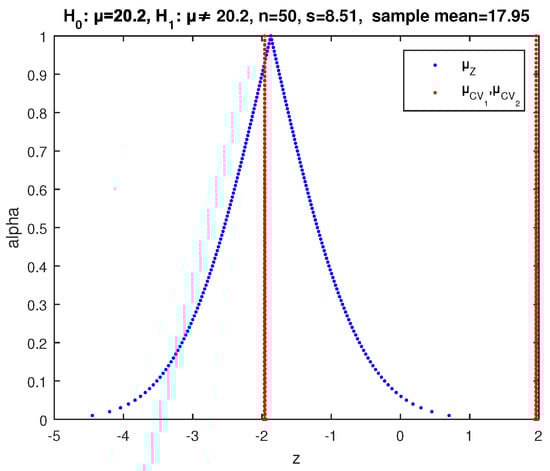 Example 5. We test the null hypothesis at significance level with alternative (two sided test) for the mean μ of a normal random variable X, using a sample of observations with sample mean and variance and .