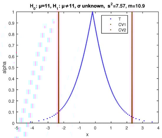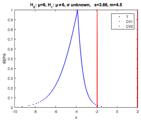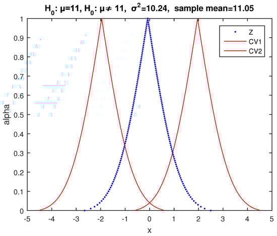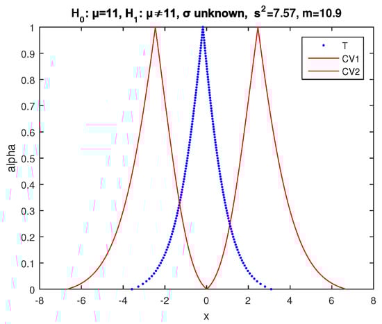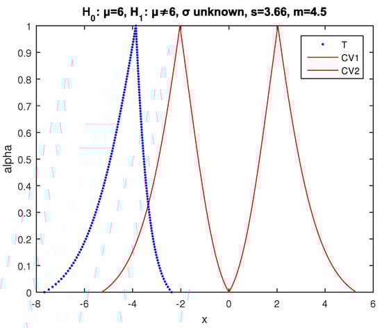 Having the cuts (57) of the possibility distribution of the fuzzy statistic T and the critical values and , we can evaluate the possibility of rejection or acceptance of from (21), (23), (26), (28) for and (58) for one-sided tests or from (31), (32), (34) and (59) for the two-sided test.