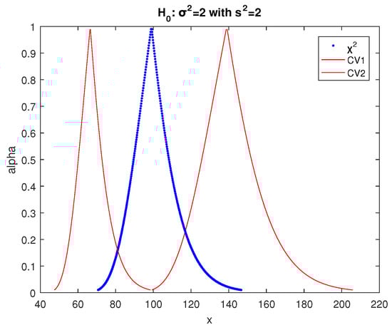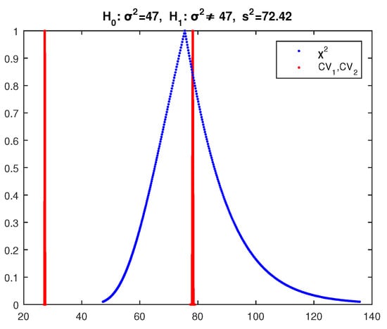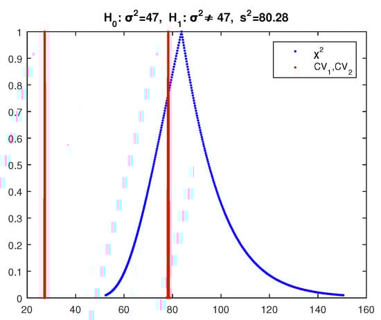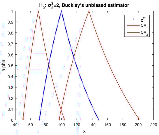 Example 4. We test the null hypothesis at significance level with alternative (two-sided test) for the variance of the temperature X, using the two large random samples of 50 observations each of the Appendix A (monthly values for selected Greek weather stations) [37]. The crisp value of the test statistic (43) for the first sample is found by (47) to be as follows (the sample variance is
